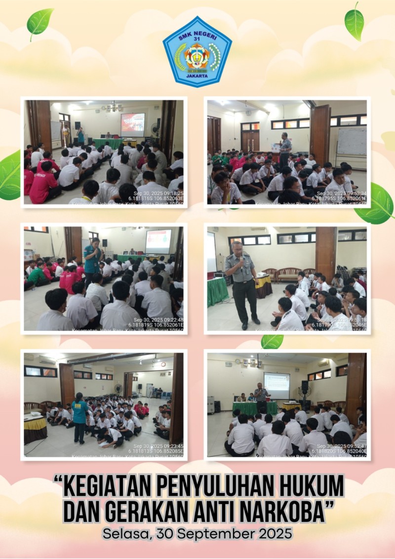 Dalam upaya menumbuhkan kesadaran hukum di kalangan peserta didik, SMKN 31 Jakarta mengadakan kegiatan Penyuluhan Hukum pada Selasa, 30 September 2025. Kegiatan ini berlangsung di Aula 101–103 mulai pukul 08.00 WIB hingga selesai, dengan diikuti oleh seluruh peserta didik laki-laki kelas X dan XI.