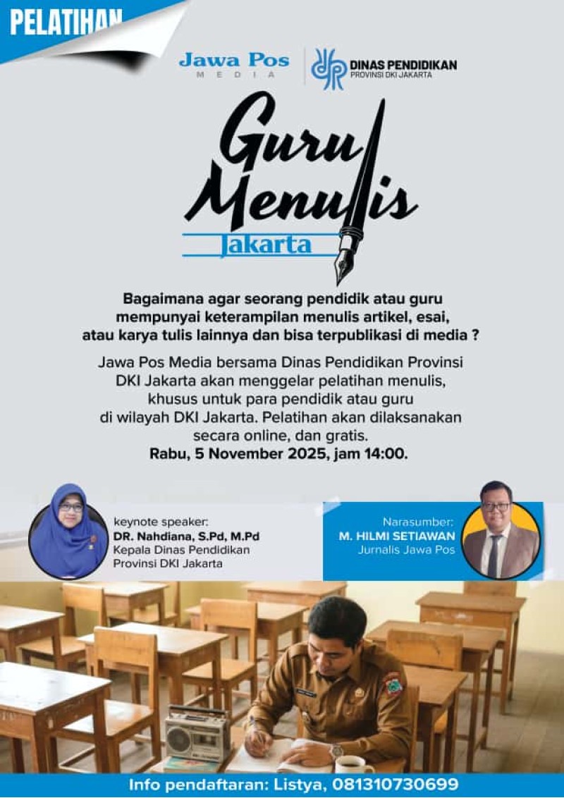 Jakarta, Rabu, 5 November 2025 — Dalam rangka meningkatkan kemampuan literasi dan menumbuhkan semangat menulis di kalangan pendidik, Jawa Pos bekerja sama dengan Dinas Pendidikan Provinsi DKI Jakarta menyelenggarakan Pelatihan Menulis Artikel dan Opini untuk Guru.