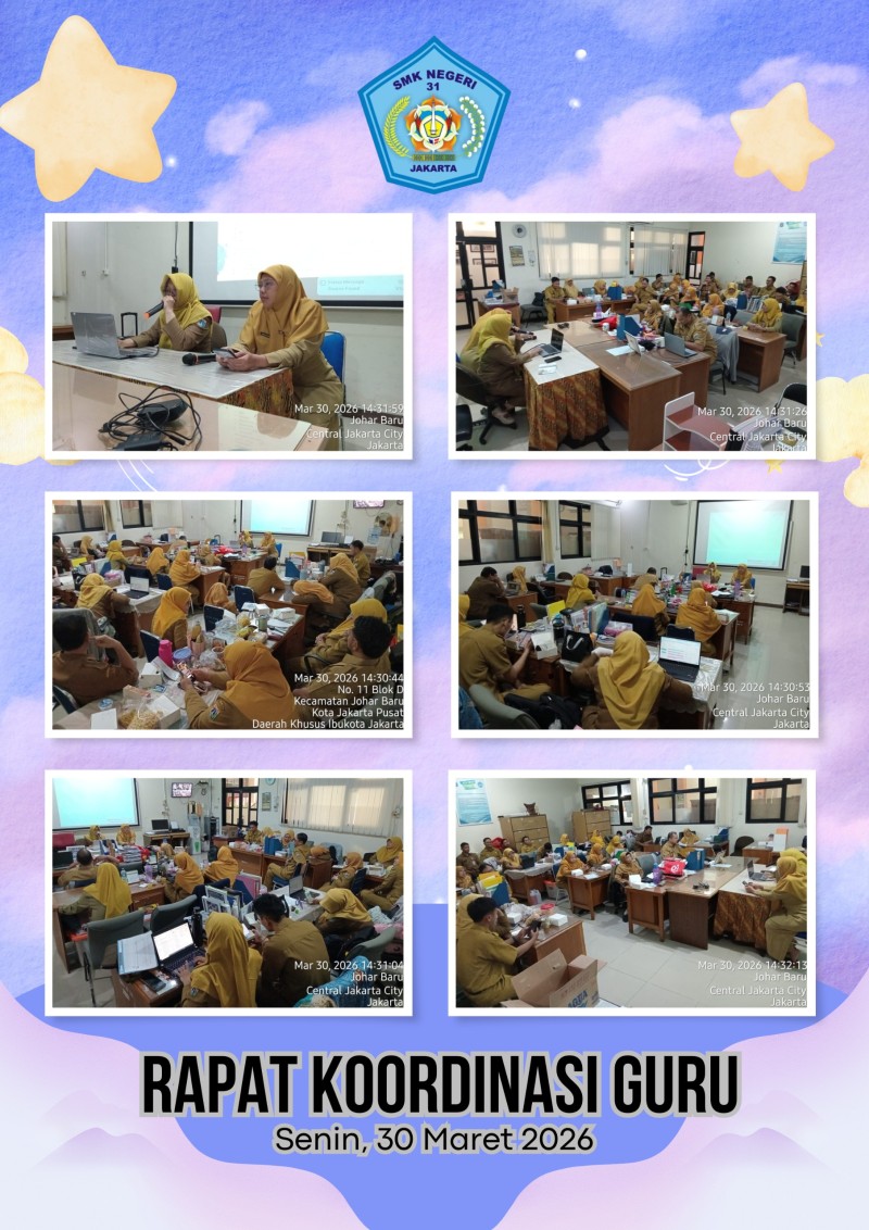 JAKARTA, 30 Maret 2026 — Setelah melewati masa libur Ramadhan dan perayaan Idul Fitri, suasana di SMKN 31 Jakarta kembali berdenyut dengan semangat baru. Mengawali hari pertama sekolah, seluruh jajaran Guru dan Tenaga Kependidikan (Tendik) langsung menggelar agenda rutin yang menjadi fondasi profesionalisme sekolah: Rapat Koordinasi di Ruang Guru.